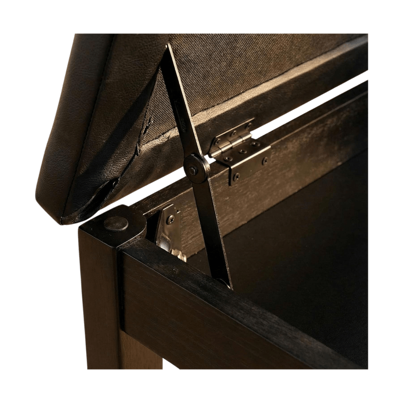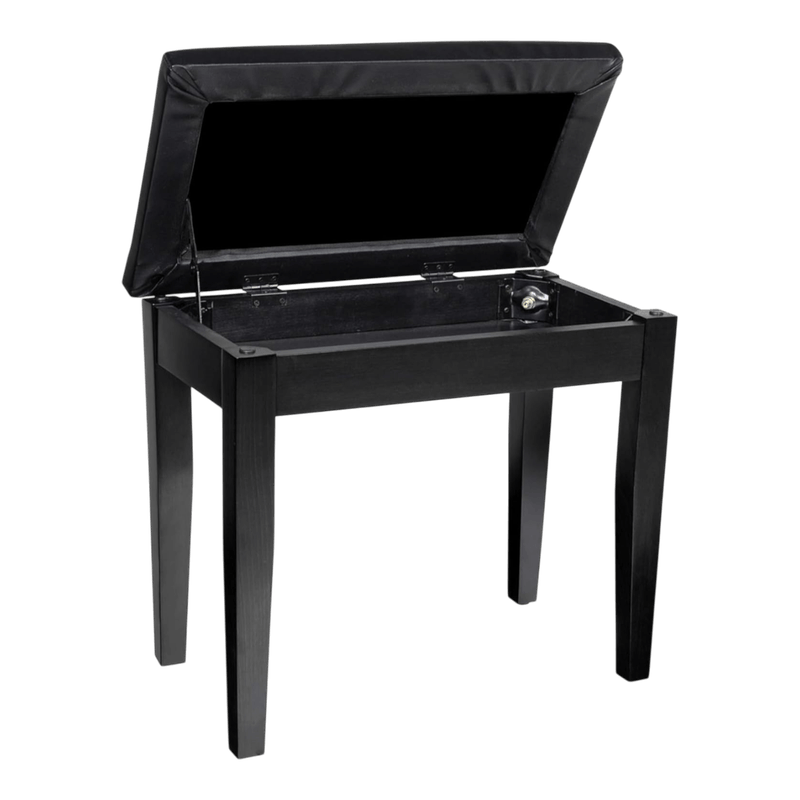 Além do assento amplo e acolchoado, que proporciona apoio ergonômico mesmo em longas sessões, o PB1-BK se destaca pelo compartimento interno integrado. A tampa articulada revela um espaço prático para armazenar partituras, métodos, pedais e acessórios, mantendo o ambiente sempre organizado e funcional. É uma solução completa que une design elegante, durabilidade profissional e praticidade em um único móvel.